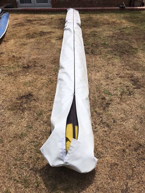 Hang glider bags are made parallel in shape except for gliders which are over 5.6 metres in length Full length heavy duty No 10 YKK zip underneath for easy fitting.There is a zip cover at each end of the bag to help prevent water from entering the zip. One end cover is held closed with velcro to cover the zip slider when closed.The seams at the end are taped and double sewn to help seal against water entering the bag. Each bag is custom made to suit different glider lengths.